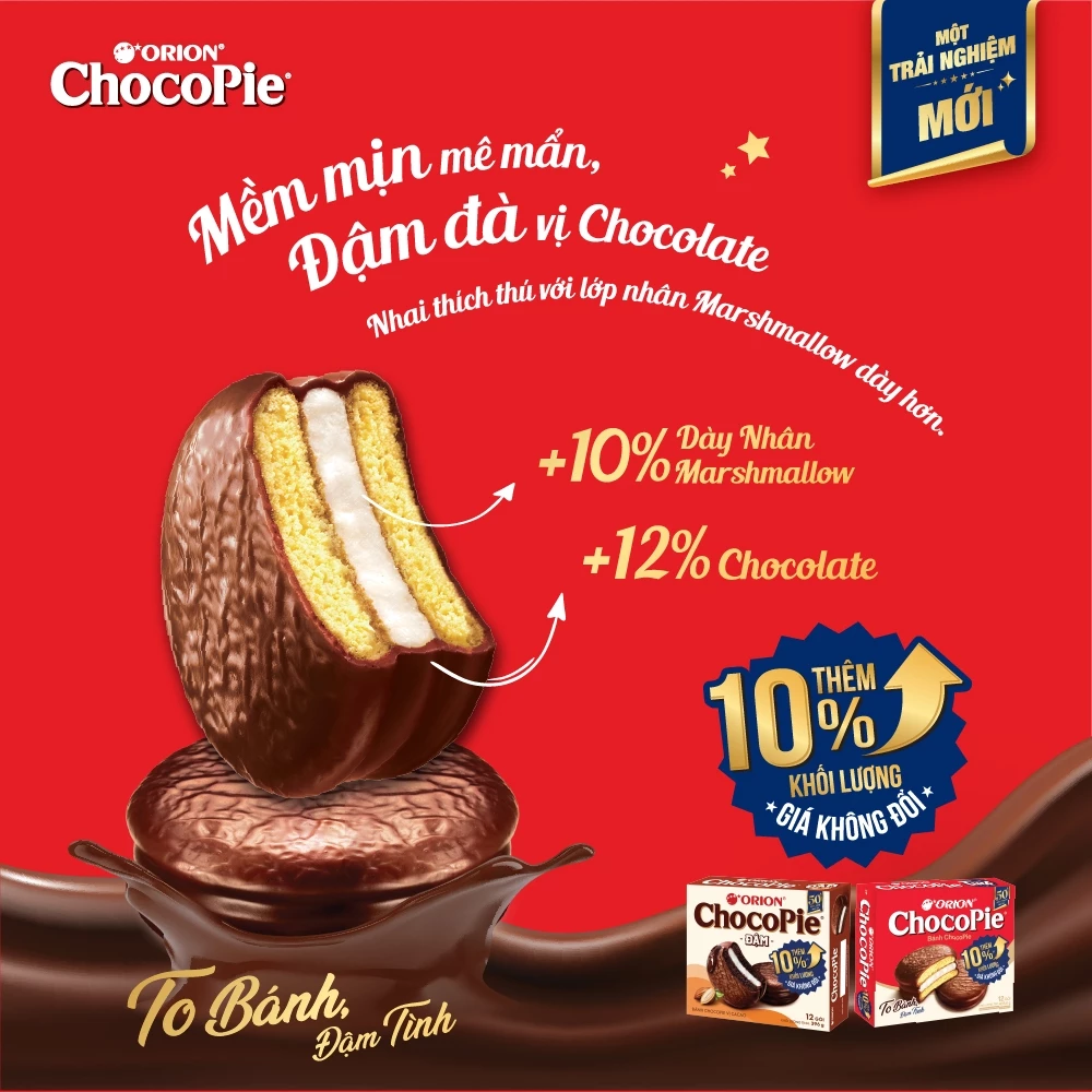 • Hương vị: Vỏ bánh cacao mềm mịn phủ chocolate đậm đà, nhân marshmallow dẻo dai độc bản.